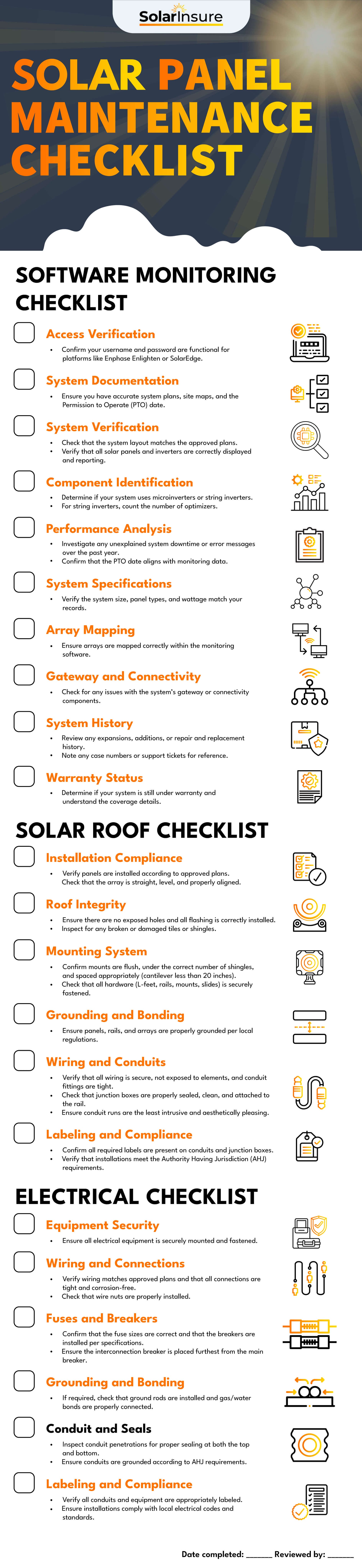 Whether installing solar panels at your home or purchasing a property with an existing solar setup, this comprehensive solar panel maintenance checklist will be an invaluable resource for you and your contractor. It’s designed to guide you through the key considerations and steps involved in ensuring a smooth, efficient solar panel installation or transfer of ownership, guaranteeing the best possible outcome for your solar energy investment.